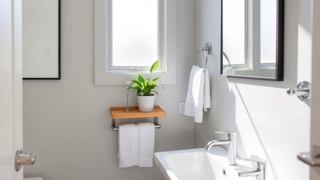 To give your bathroom a fresh look on a budget, start with eco-friendly fixtures like water-saving faucets to cut costs and help the environment. A quick coat of fresh, neutral wall paint can make the space feel larger and more inviting. Updating cabinets with new hardware or a quick repaint adds value fast. Improving lighting or adding a stylish mirror enhances the vibe effortlessly. Small touches like new towels or a patterned shower curtain complete the transformation—discover more ways to make a big impact without breaking the bank.