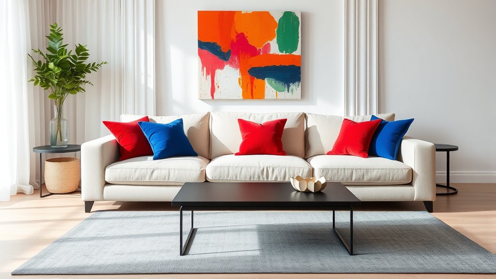 Ultimately, balancing bold colors with neutral accents isn’t about suppressing your personality; it’s about creating a visually harmonious environment. By carefully considering color pairing and integrating neutral tones strategically, you can craft a room that’s lively yet balanced, energetic yet calming. Incorporating neutral tones as a fundamental design principle ensures your space remains welcoming and stylish, with bold colors acting as highlights rather than overwhelming features.