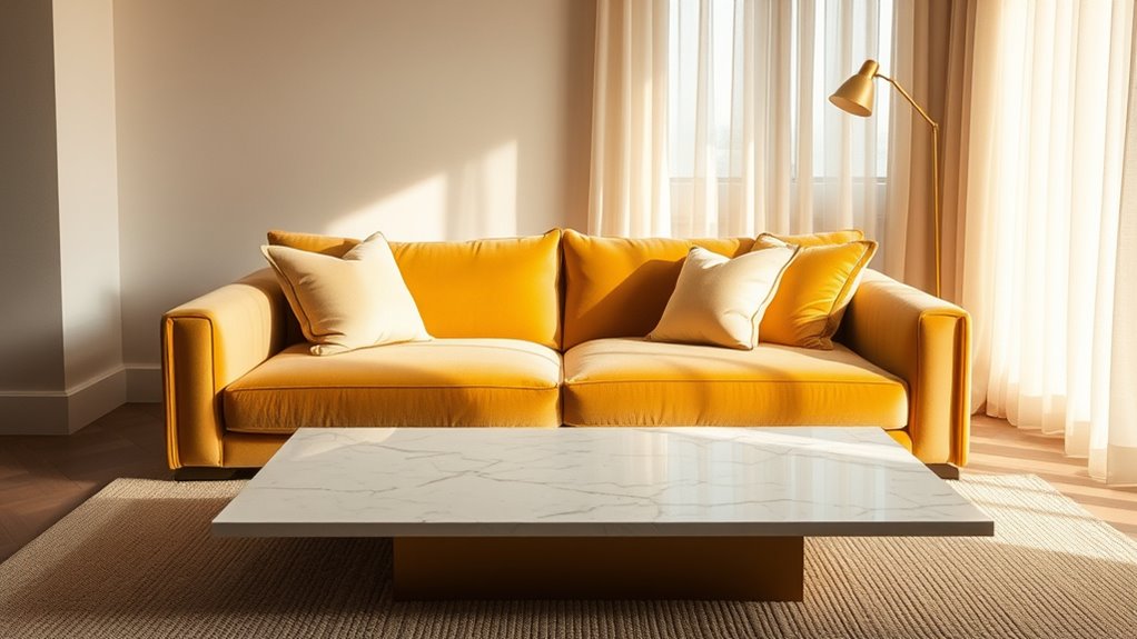 Lighting effects transform butter yellow like a chameleon, shifting its tone from warm and cozy in soft light to brighter and more vibrant in natural or harsh light. You’ll find that the right lighting enhances its subtle sophistication, setting a mood that’s both inviting and elegant. To maximize its quiet luxury, choose lighting that complements its hue, creating a harmonious atmosphere that elevates your space’s overall mood enhancement.