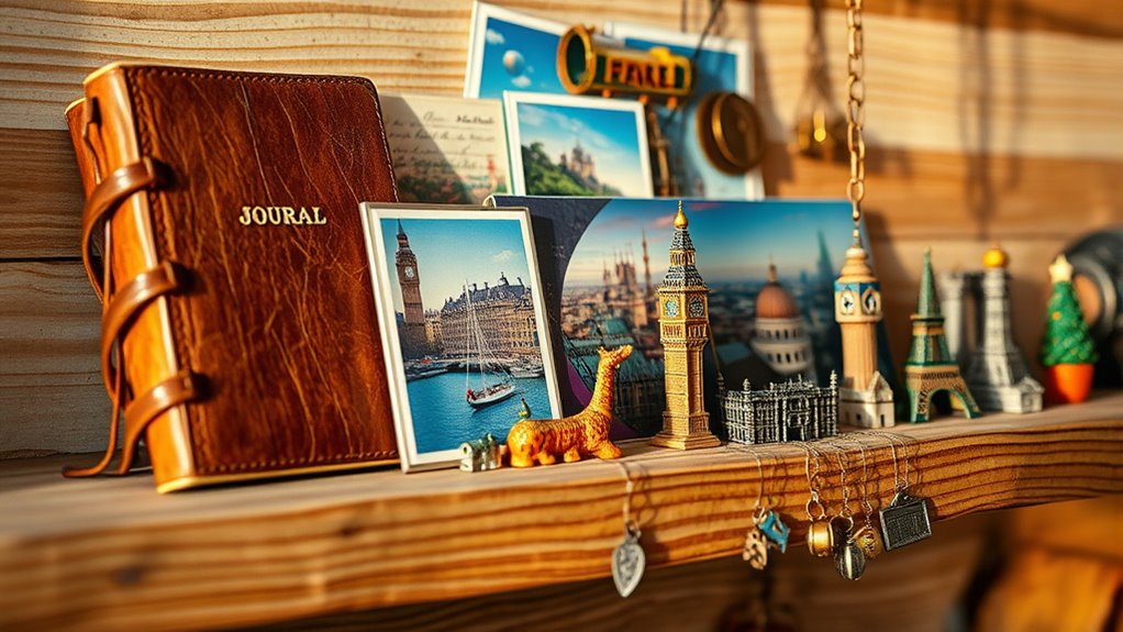 To display travel souvenirs as art, start by choosing the right frames—sleek for flat items like postcards or shadow boxes for 3D objects. Enhance your display with strategic lighting, such as adjustable spotlights or soft strips, to accentuate details and colors. Arrange your pieces thoughtfully in organized patterns or themed groups to tell a story. Pay attention to lighting and framing details to create a personalized, eye-catching display that celebrates your memories—keep exploring for more tips and ideas.