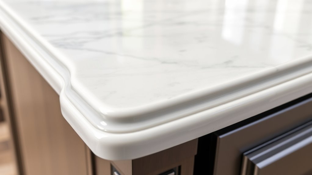 When it comes to installation tips, precision is key. Ogee edges require meticulous craftsmanship to achieve their smooth, flowing curves. If you’re installing yourself, invest in high-quality templates and tools designed for detailed edge work. Take your time marking out the profile to ensure symmetry and consistency across the entire countertop. For professional installation, communicate your expectations clearly and verify that your fabricator has experience handling ogee edges—this isn’t a job for beginners. Proper sealing and finishing are essential, especially with natural stone, to protect the intricate profile from moisture and stains. During installation, be cautious with handling and transportation to avoid chipping or cracking. When the countertop is in place, check the alignment of the ogee detail along the edges and make any necessary adjustments before final sealing. Additionally, understanding material options can help you select the best surface for your needs and budget.