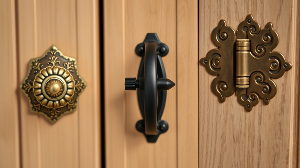 Are you looking to make a bold statement with your hardware choices? Statement hardware can transform your cabinets from ordinary to extraordinary, instantly adding personality and style to any space. When selecting these eye-catching pieces, you want to weigh current design trends to guarantee your updates stay fresh and relevant. Modern design trends favor sleek, minimalist designs, but they also embrace bold accents that serve as focal points. Whether you prefer a vintage vibe or a contemporary edge, choosing hardware that reflects current trends helps your cabinets stand out. Think about matte black finishes for a sophisticated look, or brushed brass for a warm, inviting touch. These design trends influence not only the aesthetic but also the vibe of your entire room, so pick hardware that aligns with your overall decor. Considering personal growth principles can also inspire you to select hardware that resonates with your unique style and personality. Material options are equally crucial when choosing statement hardware. You have a broad spectrum to explore, from traditional metals like brass, bronze, and chrome to more unconventional choices like matte black or antique finishes. Each material adds a unique character to your cabinets. For example, polished chrome offers a sleek, modern feel, while aged bronze provides a vintage charm. You might also consider mixed materials—knobs with crystal accents or pulls combining metal with wood for a textured, layered look. Durability is another factor; some materials resist tarnishing or corrosion better, making them ideal for kitchens or high-humidity areas. The right material not only elevates your cabinets’ appearance but also guarantees longevity, so you enjoy your statement hardware for years to come. When updating your cabinets with statement hardware, don’t shy away from experimenting with different shapes and sizes. Large, oversized pulls can create a commanding presence, while smaller, intricately designed knobs add subtle elegance. The choice of material can further enhance these design choices—think chunky, matte black pulls that make a bold statement or delicate, antique brass knobs for a more refined touch. Consider contrasting your hardware with your cabinetry color to maximize visual impact. For instance, dark hardware against light cabinets or vice versa can create striking visual contrast. Ultimately, your hardware should reflect your style while complementing your space, making it clear that you’ve thoughtfully curated every element.