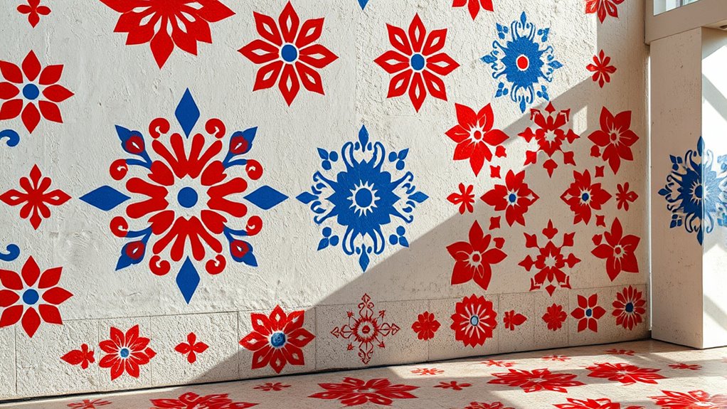 Ever wondered how artists achieve sharp, consistent designs in their artwork or home decor? It all comes down to mastering the right stencil techniques, especially when it comes to creating intricate patterns on walls and floors. One essential aspect of successful stenciling is understanding color blending. When you’re working with multiple hues, it’s tempting to rush, but careful color blending can elevate your design from simple to stunning. To do this effectively, start by choosing colors that complement each other and think about how they’ll progress within your pattern. Using a sponge or stencil brush, gently dab or stipple the paint onto your stencil, blending the edges where different colors meet. This technique creates smooth gradients and prevents harsh lines, making your pattern look more polished and professional. Keep in mind that blending works best with acrylic or latex paints that are easy to manipulate and dry quickly. Practice on a scrap surface first, so you can get a feel for how the colors meld together. Additionally, consistency in paint application is key to achieving uniformity across your design, ensuring each section blends seamlessly.