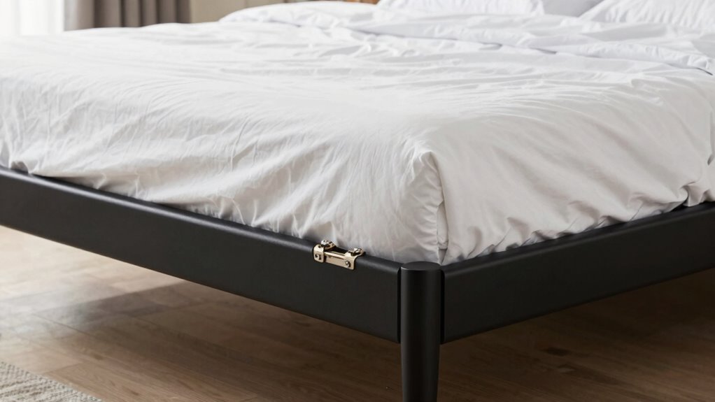 Power and noise levels in your adjustable bed frame can considerably influence your sleep quality. If the motor is loud or the power fluctuates, you might find it hard to fall asleep or stay asleep throughout the night. A quiet operation enhances comfort without disturbing your rest, while excessive noise can disrupt your sleep cycles. Additionally, the bed frame aesthetics matter—sleek, unobtrusive designs blend better into your bedroom, reducing visual clutter. When considering different models, check the warranty coverage for motor durability; a longer warranty indicates better quality and fewer worries about noise-related issues over time. Ultimately, choosing a bed frame with low noise levels and reliable power ensures a restful sleep experience and peace of mind.