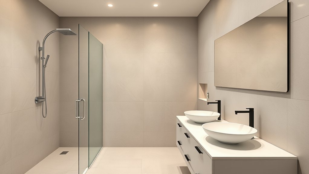 Modern bathroom renovations focus on updating layouts and fixtures to boost style and practicality. You can improve safety and ambiance by adding layered lighting, like ambient, task, and accent lights, while incorporating natural-looking LEDs to make the space feel larger. Smart storage solutions, such as built-in shelves or recessed cabinets, keep everything organized without cluttering. These upgrades create a more spacious, calming environment, and if you keep exploring, you’ll discover even more ways to transform your bathroom into a modern oasis.