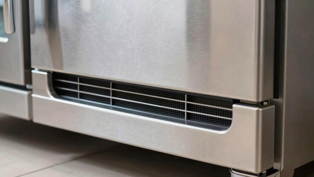 One common mistake is blocking the air vents, which prevents proper airflow and makes your fridge work harder. Overstuffing the interior can also restrict circulation, reducing efficiency. Additionally, poor placement, like placing your fridge too close to walls or heat sources, can block ventilation and cause overheating. Ensuring adequate support and boundaries around your fridge is essential for optimal performance. Proper air circulation is vital to prevent energy waste and maintain the longevity of your appliance. Remember that ventilation gaps help dissipate heat effectively and should be maintained clear of obstructions. Maintaining adequate clearance space around the fridge allows for better airflow and prevents overheating issues.