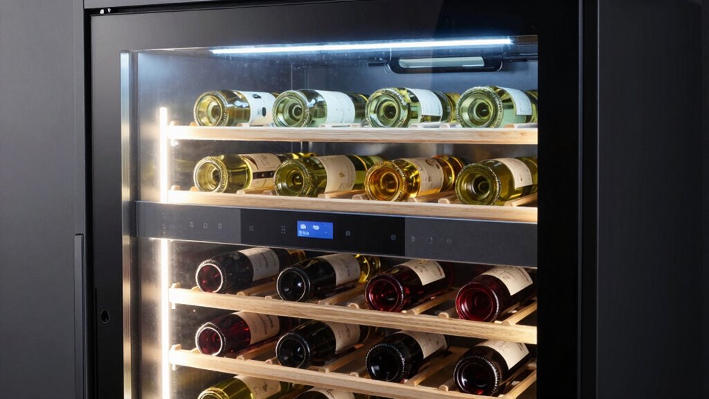Sure, your wine collection isn’t a one-size-fits-all situation. Different wine types do demand different temperature zones for ideal wine storage and temperature control. Red wines thrive warmer, around 60-65°F, while whites prefer cooler, about 45-55°F. Ignoring these nuances is like serving red wine in a white wine glass—just wrong. So, yes, tailor your wine storage to each varietal’s needs for perfect taste and longevity.