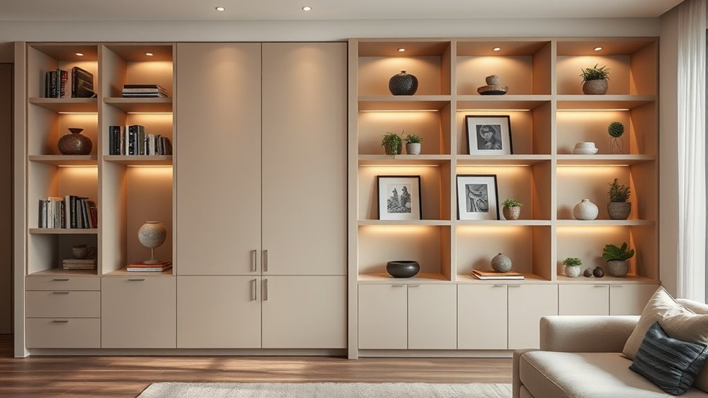 Aesthetic storage solutions are vital for keeping your space organized without sacrificing style. When it comes to built-in cabinets and open shelves, you have the opportunity to create a seamless look that enhances your room’s overall vibe. One of the most appealing aspects of these solutions is their ability to be tailored to your personal taste through custom finishes. Whether you prefer sleek, modern laminates or warm, textured wood veneers, custom finishes allow you to match or complement your existing decor effortlessly. This personalization guarantees that your storage isn’t just functional but also a cohesive part of your design scheme, elevating the room rather than cluttering it.