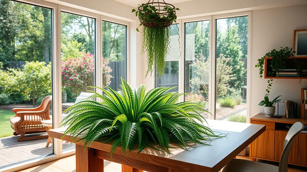 Think of low-light plants like the resilient snake plant or pothos, thriving in dim corners of your home office. These plants are excellent for air purification and pest control, helping to improve your workspace environment. They require minimal sunlight, making them perfect for low-light conditions. Plus, their easy care means you can enjoy a touch of nature without extra effort, boosting your mood and focus every day.