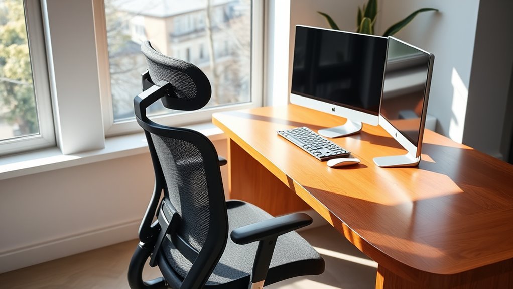 Think of your body as a unique puzzle—there’s no one-size-fits-all! For your ergonomic setup, look for features like adjustable lumbar support and seat depth, which tailor the chair to your body’s shape. These features guarantee proper support and comfort, regardless of your size or posture needs. By customizing your chair, you’re not just sitting—you’re investing in your health and comfort, puzzle-piece perfect.