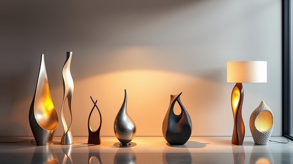 You’ll find a wide materials diversity in sculptural lamps, including metals like brass and copper, ceramics, glass, wood, and even recycled materials. Artists use various artistic techniques to shape these materials into unique, eye-catching forms. This combination of diverse materials and creative craftsmanship results in functional art pieces that serve as both lighting and sculptures, adding personality and style to your space.