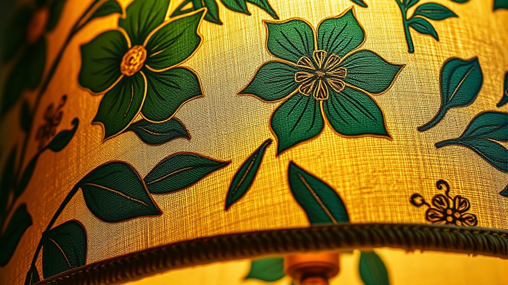 Bespoke lampshades with custom patterns and textures let you create a truly unique and personal style for your space. You choose fabrics, colors, and designs that reflect your taste, transforming your lighting into a statement piece. Different textures and patterns influence how light filters, setting the mood you want—cozy, vibrant, or tranquil. Keep exploring to discover how you can craft one-of-a-kind lampshades that perfectly match your interior.