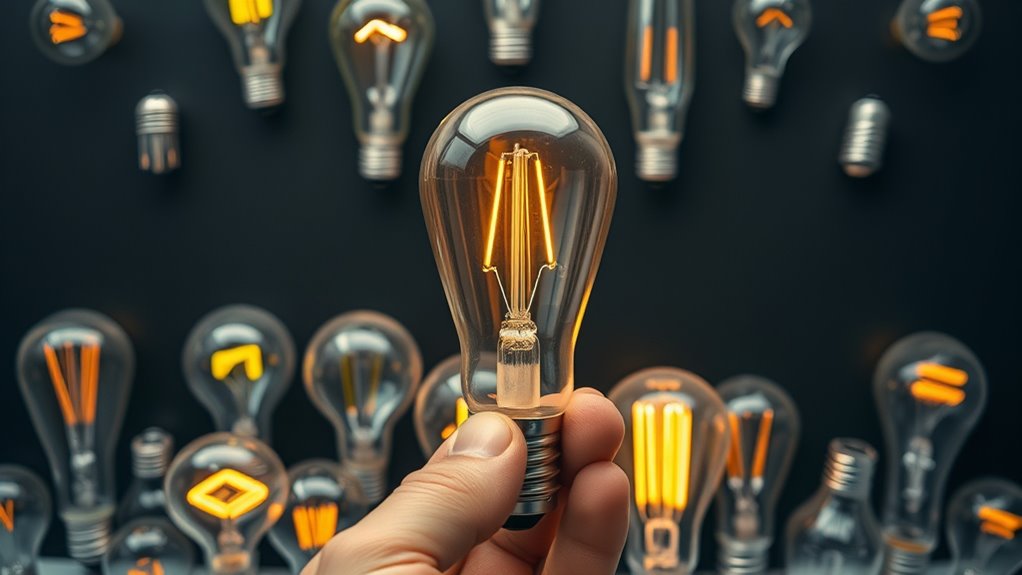 So, next time you’re shopping for bulbs, remember to consider lumens for brightness, color temperature for mood, and efficiency for savings. For example, imagine replacing your living room lights with LEDs that offer warm light and high efficiency—you’ll enjoy cozy ambiance without skyrocketing bills. By understanding these factors, you can make smarter choices that brighten your space beautifully and save you money in the long run. Happy bulb hunting!