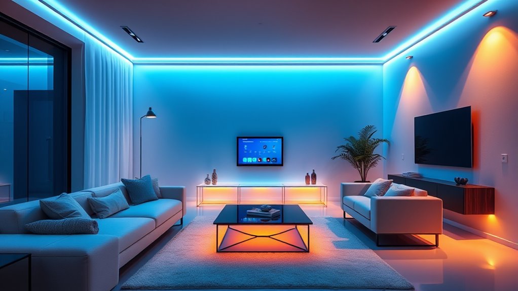 Furthermore, smart lighting systems integrate seamlessly with other smart home devices, allowing you to automate routines effortlessly. You can synchronize lighting with music, security systems, or climate controls to create a cohesive environment. Voice assistants like Alexa or Google Assistant make adjustments even more straightforward—just a simple command is enough to change the lighting or set a scene. This automation not only adds convenience but also enhances your overall well-being by simplifying daily routines and helping you stay organized. In essence, smart lighting systems do more than illuminate—they transform your home into a smarter, more efficient, and mood-enhancing sanctuary tailored to your lifestyle.