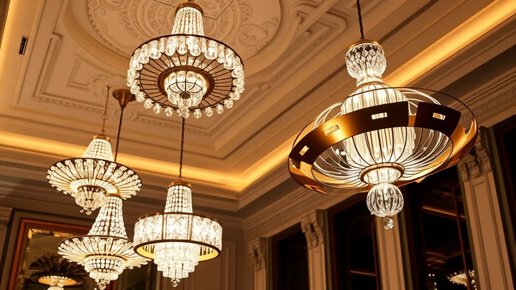 Statement chandeliers and sculptural pendants act as eye-catching focal points that transform your space with artistic flair and bold design. They combine innovative shapes, sculptural forms, and unique materials to add personality and drama to any room. These fixtures do more than just light up a space—they make a statement. Keep exploring to discover how you can select the perfect piece that highlights your style and enhances your decor.