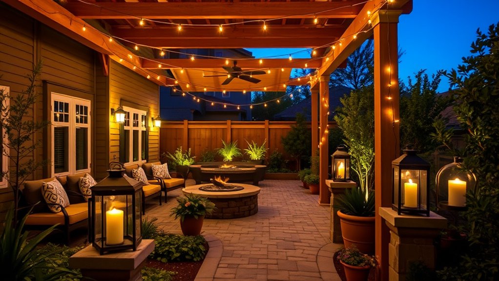 To plan outdoor lighting, start by combining string lights for a warm, inviting glow along pergolas or trees, lanterns to add ambiance on tables or paths, and pathway lights to make certain of safety and define spaces. Use different styles to layer your illumination, creating a cozy or lively atmosphere that suits your needs. Consider smart controls for convenience and energy savings. Keep exploring to discover tips that help create your perfect outdoor retreat.