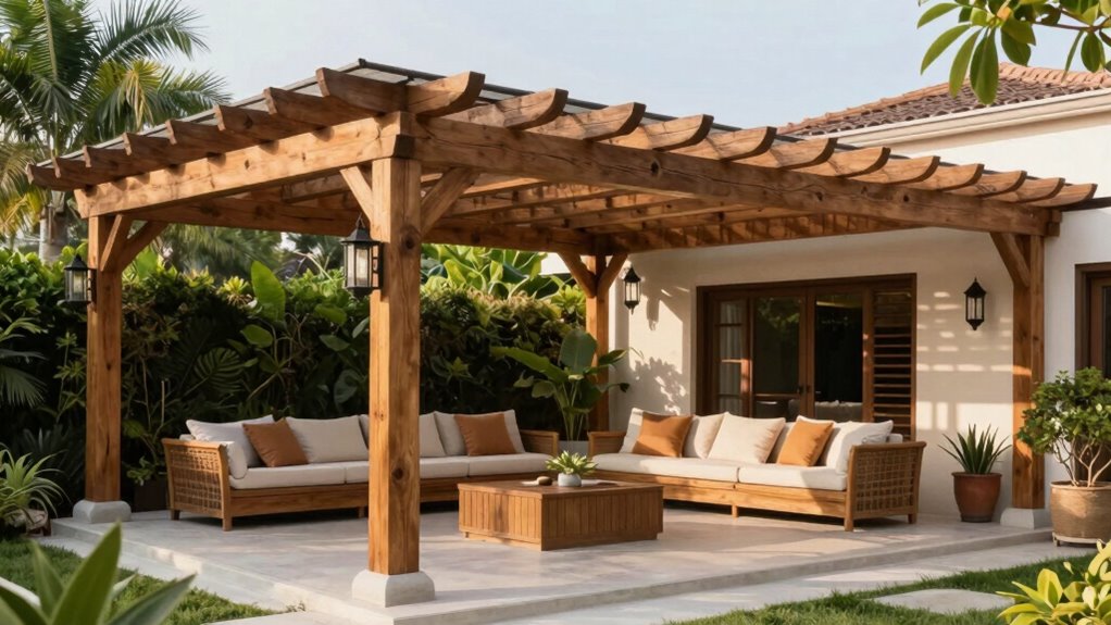 Achieving visual balance and harmony in your pergola design starts with understanding how its scale relates to the surrounding space. You want your structure to complement, not overpower, the patio and yard. To do this effectively: