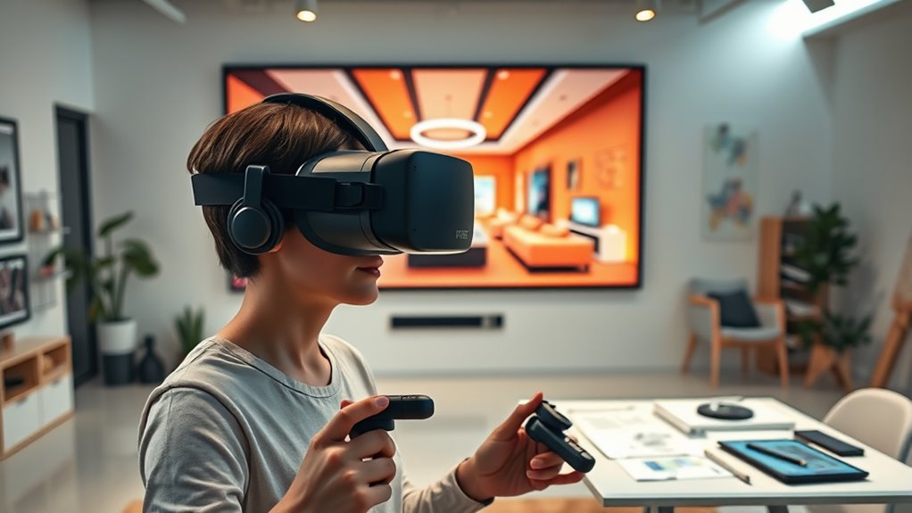 Using 3D renderings and virtual reality in your design projects allows you to create immersive, realistic visualizations that improve communication with clients. These tools help you showcase your ideas clearly, refine concepts quickly, and explore various options in real-time. VR experiences enable clients to walk through spaces and understand scale and details better. If you keep exploring, you’ll discover how these innovations can revolutionize your design process and client satisfaction.