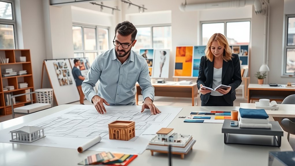 Working with architects and interior designers involves understanding their distinct roles. Architects focus on creating safe, functional structures, handling plans and building codes, while interior designers concentrate on aesthetics, color schemes, and furnishings to enhance your space. Collaborating from the start guarantees your project is both well-built and beautiful. If you want to learn how their teamwork can lead to a cohesive, efficient design, keep exploring how they work together.