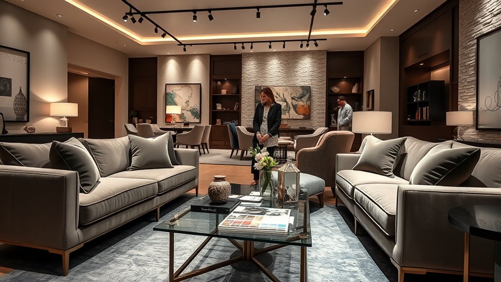 You should explore current interior design trends that emphasize calming color palettes like muted greens, warm neutrals, and soft blues. Material choices are shifting toward sustainable options such as reclaimed wood, textured fabrics, and eco-friendly composites. Incorporate these trends into your space to create a modern, inviting atmosphere. An experienced designer can help you blend these elements seamlessly, ensuring your home stays stylish and functional.