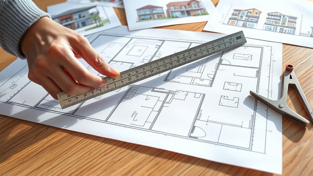 Most residential floor plans use a scale of 1/4 inch equals 1 foot, making the drawing manageable and easy to interpret. You’ll find scale conventions that typically employ measurement units like inches or feet. Notably, this scale allows you to accurately visualize spaces while keeping the plan compact. Always check the plan’s legend to confirm the specific scale used, ensuring you understand the proportions and measurements correctly.