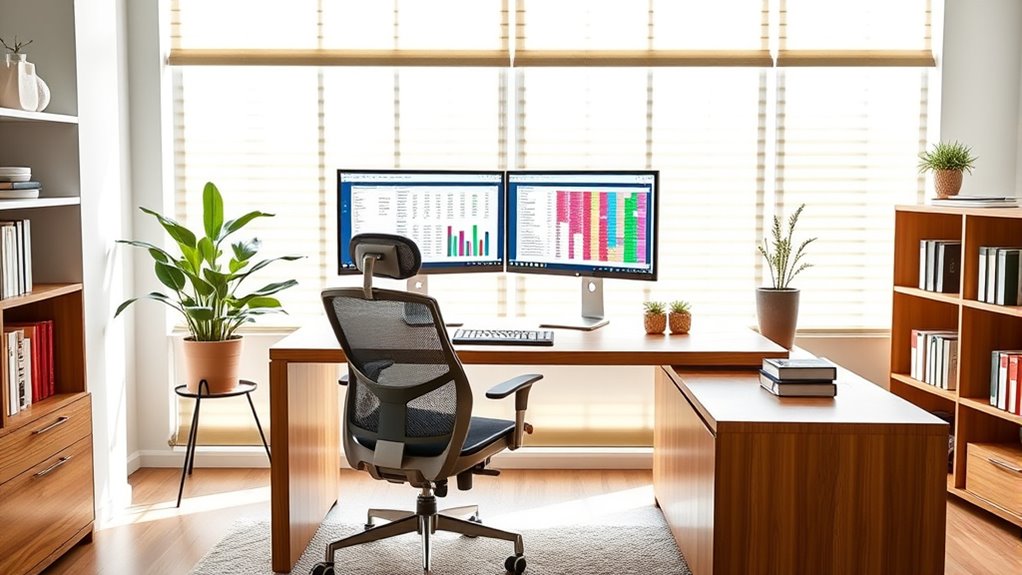 To create a productive home office, start with ergonomic furniture like an adjustable chair and desk to keep you comfortable all day. Maximize natural light near your workspace and add layered lighting with desk lamps to reduce eye strain. Keep frequently used items within arm’s reach and organize cables to prevent clutter. Maintaining a dedicated, clutter-free area promotes focus. Explore these tips further to design a space that enhances your comfort and efficiency.