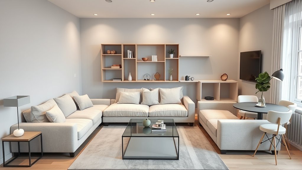 To save space in your tiny living room, opt for multifunctional furniture like sofa beds or storage ottomans that serve dual purposes. Keep your decor minimalist to reduce clutter and create a sense of openness. You might also choose wall-mounted shelves or fold-away tables to maximize floor space. These choices make your room feel larger and more functional without sacrificing style, making the most of every square inch.