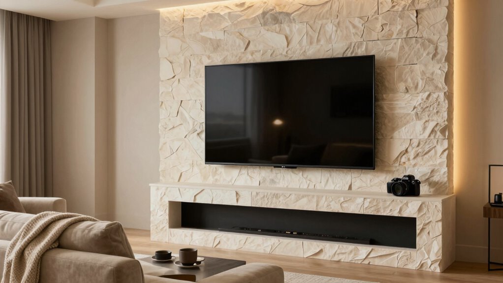 Yes, some mounts are designed specifically for uneven or textured fireplace walls. Look for full-motion or articulating mounts that offer adjustable arms, which help you adapt to different mounting surfaces. These mounts provide flexibility to secure your TV firmly, even on rough or irregular wall textures. Choosing a mount with a strong grip and adjustable features guarantees your TV stays stable and at the right viewing height, regardless of your wall’s surface.