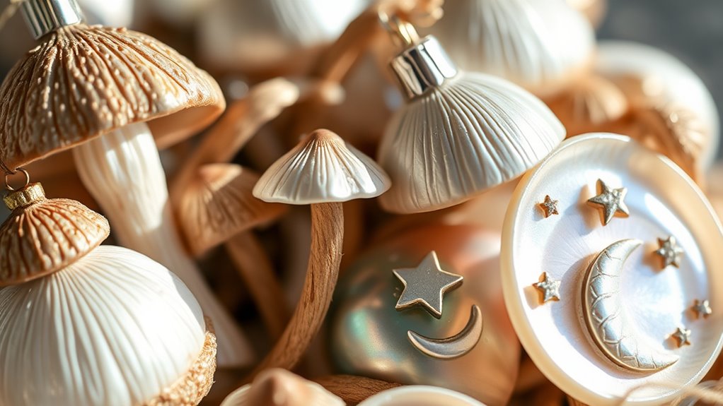 Handcrafted ornaments featuring mushrooms, shells, and celestial motifs combine artistry, tradition, and nature’s beauty. You’ll find each piece crafted with care, using techniques like hand carving, painting, and molding that add texture and character. These designs celebrate authenticity and sustainability, often made from responsibly sourced materials. Incorporating them into your home creates a personal, natural connection, highlighting craftsmanship rooted in tradition. Keep exploring to discover how these unique touches can inspire your space and style.