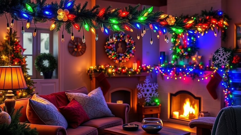 Transform your holiday space with vibrant multi-colored LED string lights and nostalgic ornaments that evoke warmth and charm. Drape the lights along staircases, outline windows, or create eye-catching backdrops, adding a lively atmosphere. Incorporate vintage ornaments like glass baubles or handcrafted figures to evoke heartfelt memories and personality. Mix modern and traditional decor for a joyful, eclectic look. Keep exploring for more creative tips to make your celebration truly special.