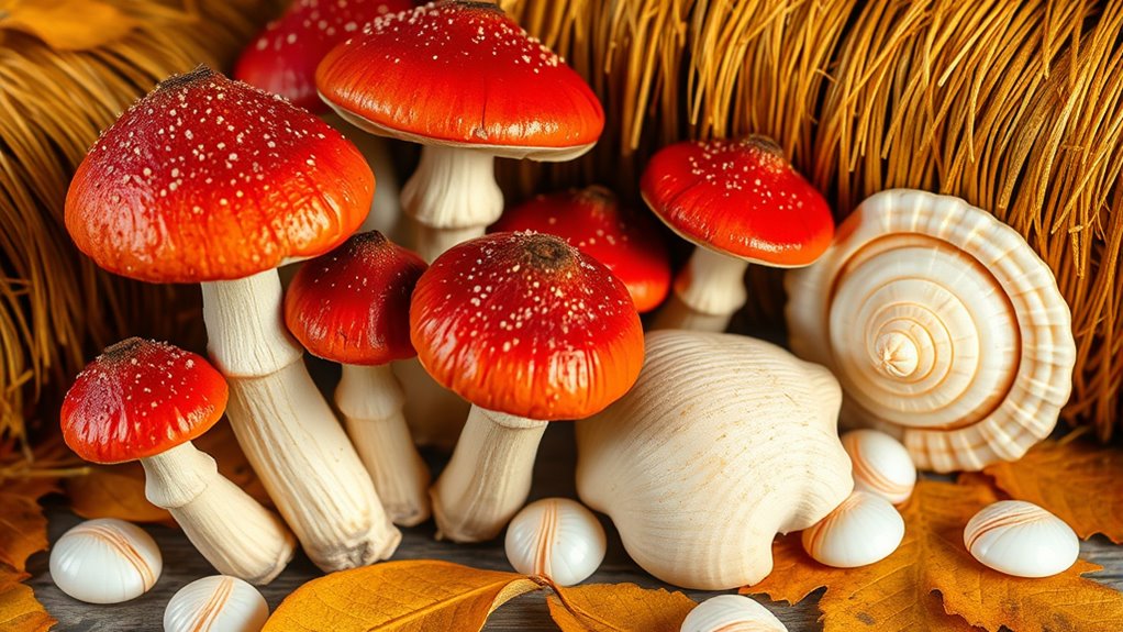 Did you know that faux mushrooms and shells are among the most popular autumn décor choices? For realistic results, opt for faux mushroom varieties made from resin or silicone, which mimic textures perfectly. For shells, consider options like resin or ceramic, offering durability and authentic appearance. These shell material options make your decorations last longer while maintaining natural appeal. You’ll love how these materials enhance your seasonal display effortlessly.