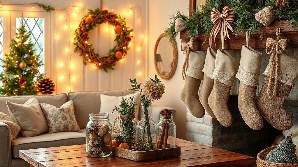 Natural decorations are generally safe for pets and children, but you should always consider pet safety and the differences between natural vs synthetic materials. Avoid using plants like holly, mistletoe, or pine with berries, as they can be toxic. Keep candles out of reach and monitor any natural items for mold or pests. By choosing non-toxic, natural decorations, you can enjoy festive cheer without risking your loved ones’ safety.