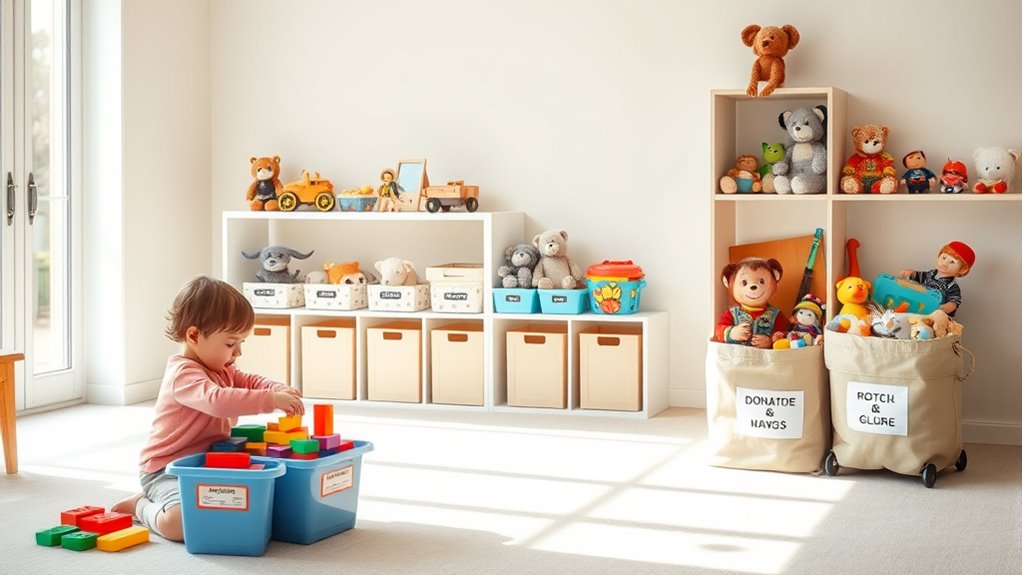 To declutter kids’ toys, set up creative storage options like labeled baskets and furniture with built-in compartments that match your space and your child’s interests. Implement a routine for weekly toy rotations, so play areas stay fresh, and involve your kids in donating unused toys to teach sharing. Regularly sorting, rotating, and donating keeps clutter in check and makes cleanup easier. Keep exploring for more tips to maintain an organized, joyful play space.