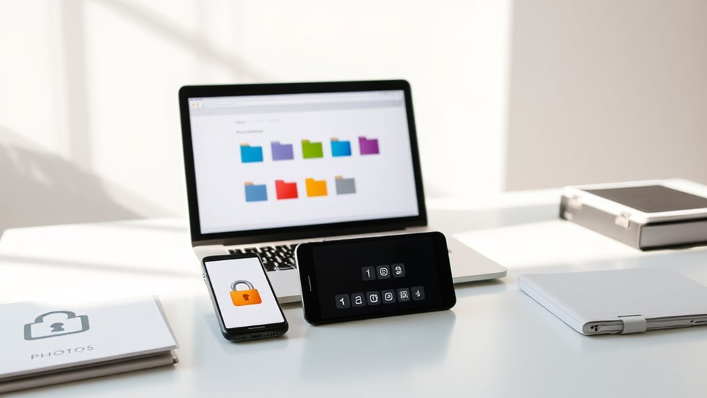 Have you ever felt overwhelmed by the endless digital clutter filling your devices? It’s easy to get lost in a sea of files, photos, and passwords, but the good news is that you can regain control with a simple approach. One of the most effective ways to start decluttering is by utilizing cloud storage. Instead of saving everything directly on your device, you can upload files to a secure cloud platform like Google Drive, Dropbox, or OneDrive. This not only frees up space but also guarantees your files are backed up and accessible from any device. As you upload, it’s vital to organize your files into clearly labeled folders so you can find what you need without sifting through endless clutter.