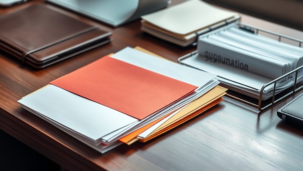 Imagine a cluttered desk versus a neatly organized filing cabinet; you can instantly find what you need. To organize papers for easy access, use clear file categorization and a consistent label system. Group similar documents together, like bills or receipts, and label each folder precisely. Keep frequently accessed files within arm’s reach, and regularly review and purge unnecessary papers. This method helps you locate important items quickly and stay organized effortlessly.