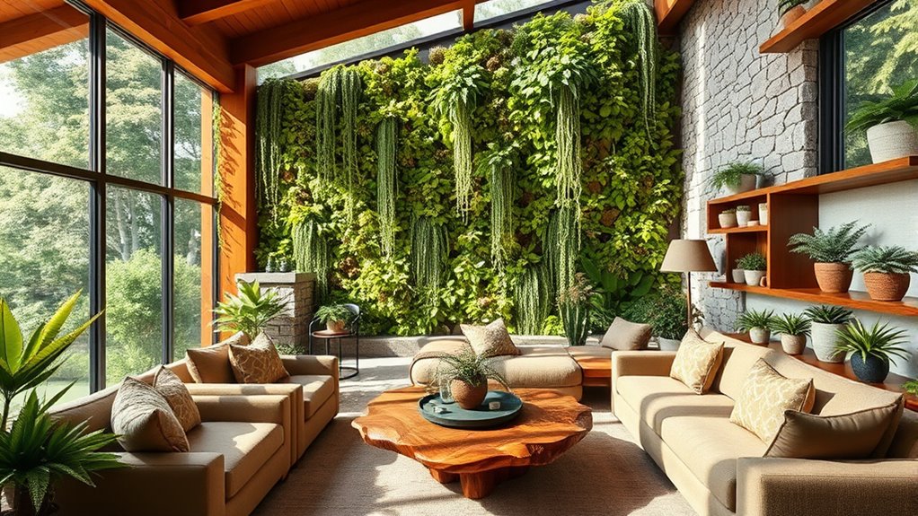 Sustainable and biophilic design focuses on bringing natural elements into indoor spaces to improve your well-being and lessen environmental impact. By incorporating greenery, natural light, and organic materials like wood or bamboo, you create environments that feel calming and healthier. These approaches not only boost mood and comfort but also support eco-friendly practices. If you’re curious about how to seamlessly integrate nature indoors, you’ll find useful insights that can transform your space and lifestyle.