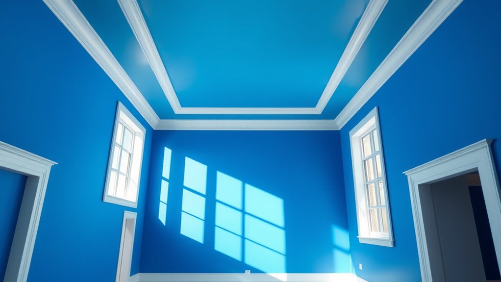 In practice, start by choosing your core color based on the mood you want to evoke, then select the appropriate finish for each surface. Use consistent color tone across walls, ceilings, and trim, but vary the finish to create subtle distinctions. This approach ensures your space feels unified yet dynamic. Additionally, understanding how color consistency influences visual perception can help you achieve a more balanced and harmonious result. Remember, the key to successful color drenching lies in precision and harmony. When you understand how color psychology influences perception and how different paint finishes can enhance or soften your chosen hue, you’re better equipped to craft a room that’s both visually striking and emotionally resonant.