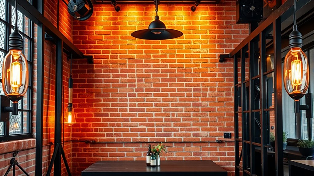 To achieve an industrial chic look, focus on combining exposed brick walls with metal accents like pipe lighting and shelving. Use warm lighting such as Edison bulbs to soften the raw textures and create a cozy atmosphere. Incorporate reclaimed wood and vintage furniture for authentic charm. Balancing rough surfaces with warm light details enhances the inviting yet gritty vibe. Curious to see how these elements come together? Keep exploring for tips to master this stylish, industrial-inspired aesthetic.