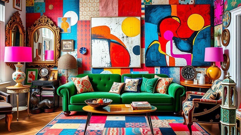 To master maximalist eclectic style, you should embrace bold colors and unexpected mixes. Combine jewel tones with warm earth shades or neon accents with muted backgrounds to create vibrant energy. Layer patterns like florals with geometrics or stripes with paisleys, balancing them with textures and accessories. Play with contrasts and personality to craft a space full of life and surprise. Keep exploring for tips to refine your unique, dynamic interior look.