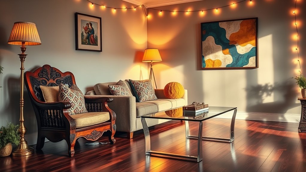 To mix different eras without overwhelming your space, start with a cohesive color palette that balances vintage and modern elements. Use furniture placement strategically by placing statement retro pieces as focal points and balancing them with sleek, modern furniture. Keep accessories minimal to avoid clutter. This approach creates harmony, highlights each era’s charm, and guarantees your space feels curated rather than chaotic.