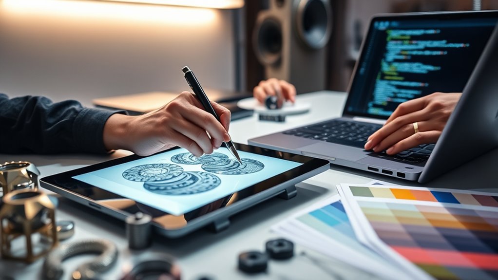 Moreover, these partnerships challenge you to think holistically. You’re not just designing for aesthetics or functionality in isolation; instead, you’re creating cohesive experiences that blend visual appeal with smart technology. This requires clear communication, mutual respect, and a willingness to learn from each other’s expertise. As your collaboration deepens, you discover new ways to incorporate user data, IoT connectivity, or augmented reality into your designs, elevating the entire user journey. Ultimately, the success of these partnerships hinges on your ability to coordinate aesthetics and function, guaranteeing that innovative strategies are rooted in a genuine understanding of user needs.