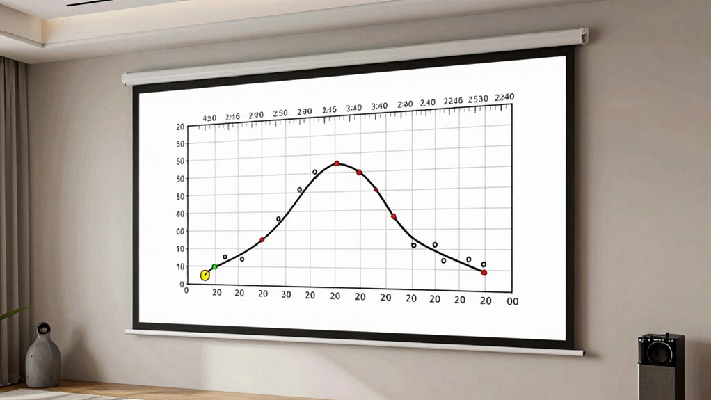 Optimizing your screen placement involves more than just choosing the right size; it also means positioning it correctly within your space. To guarantee ideal viewing, consider mounting techniques that suit your room layout and screen material for clarity. Adjusting your screen’s height and angle can enhance movie, gaming, or presentation experiences. Use this table as a guide: