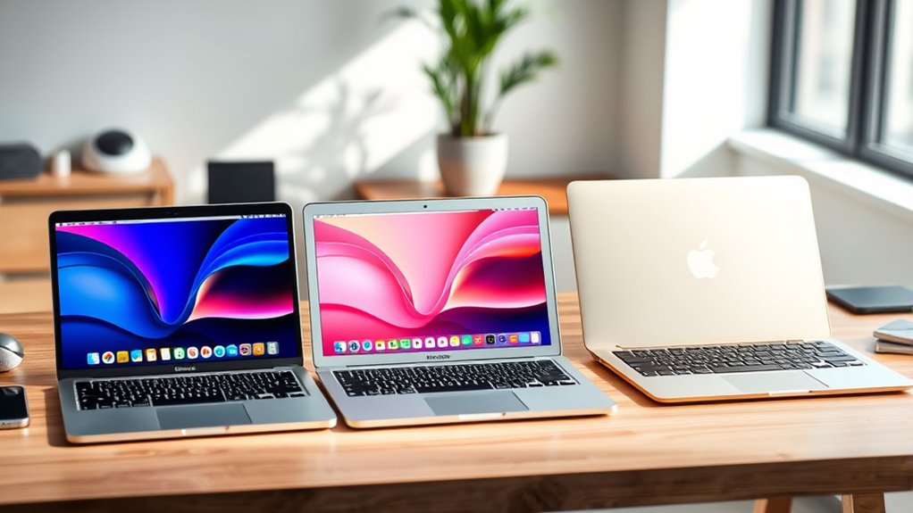 Selecting the right processor performance level is essential because it directly impacts your MacBook Air’s speed and efficiency. A higher-core CPU, like the 10-core M4 chip, markedly improves multitasking and processing speed, making demanding tasks smoother. If you work with graphics-intensive applications such as video editing or 3D rendering, choosing a model with a 10-core GPU can boost performance. The Neural Engine’s core count also matters; more cores enable faster AI and machine learning tasks, enhancing features like image processing and voice recognition. Keep in mind, upgrading to a more powerful processor usually increases cost and power consumption. So, consider your typical workload and future needs. Balancing performance with budget and battery life ensures you select the best processor level for your use case.