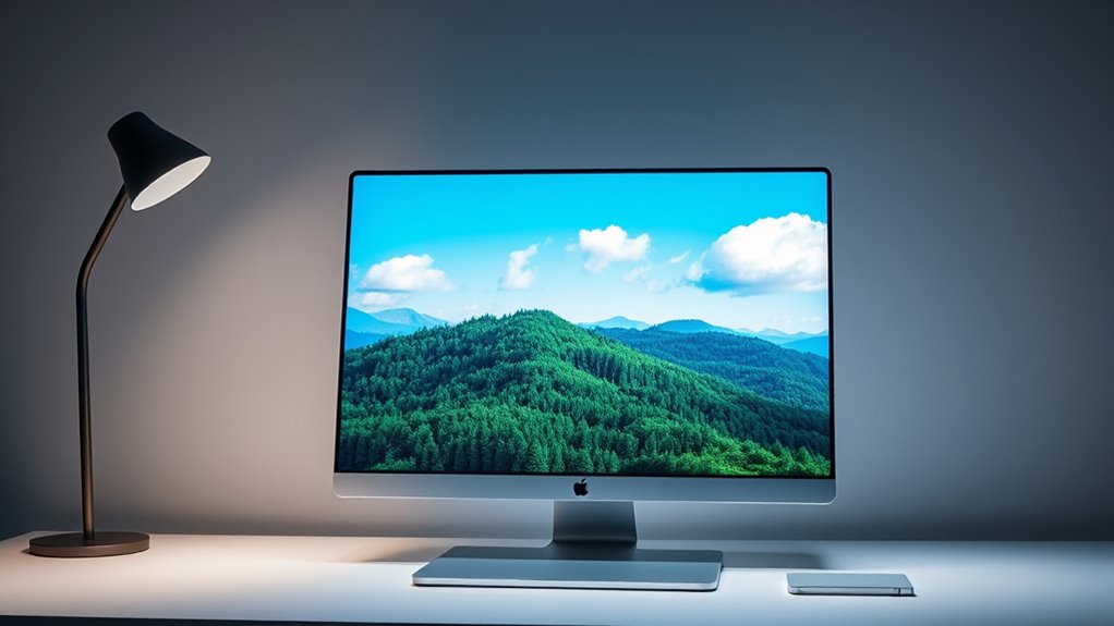 Brightness and contrast are crucial factors that determine how well a 5K monitor performs when paired with a MacBook Pro. Higher brightness levels, like 1000 nits sustained and 1600 nits peak, make images pop and improve visibility in bright environments. A contrast ratio of 1,000,000:1 delivers deep blacks and vibrant whites, enhancing the display’s dynamic range. These features are essential for accurately rendering shadows and highlights, especially in professional workflows that demand precision. Consistent brightness performance helps guarantee reliable color reproduction and reduces eye strain during long work sessions. When selecting a monitor, prioritize those with high brightness and contrast capabilities—these qualities directly impact your viewing experience and the quality of your visual work.