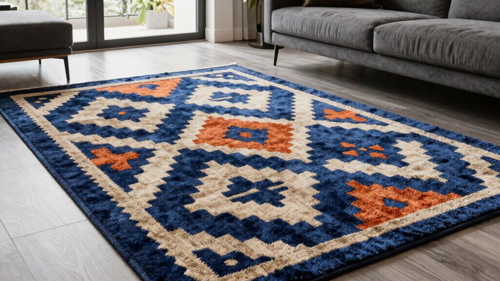 Did you know that slip-and-fall accidents are responsible for about 25% of all emergency room visits? To prevent slipping on large area rugs, I always use non-slip rug pads underneath. They grip the floor and hold the rug in place, even in busy areas. I also avoid placing rugs on slippery surfaces like hardwood without a pad, and I regularly check for wear to keep everything secure.