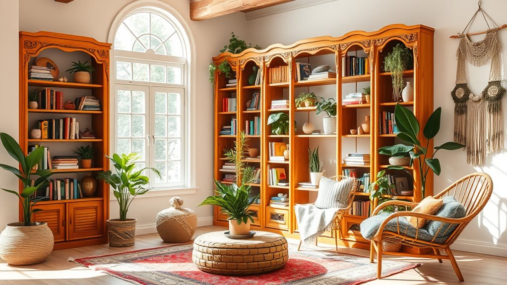 - Boho bookcases blend vintage, farmhouse, and industrial styles for versatile, trendy decor options.