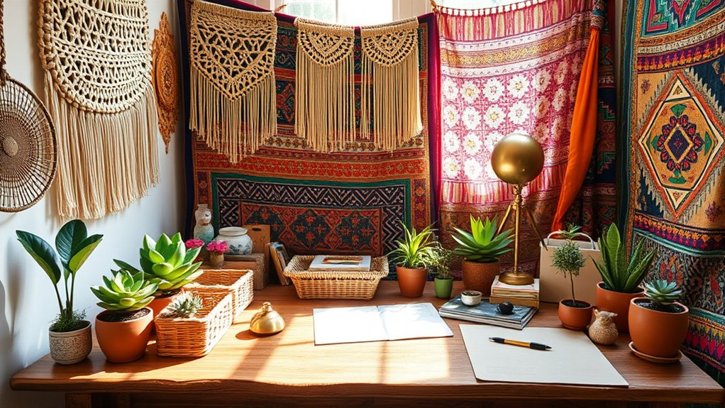 When selecting boho desk décor, I always consider how it matches my style and overall aesthetic to keep my space cohesive. I also think about the materials and durability to guarantee my pieces last, as well as the size and proportion so everything fits comfortably. Finally, I weigh the price against quality to make sure I get good value without compromising on look or function.