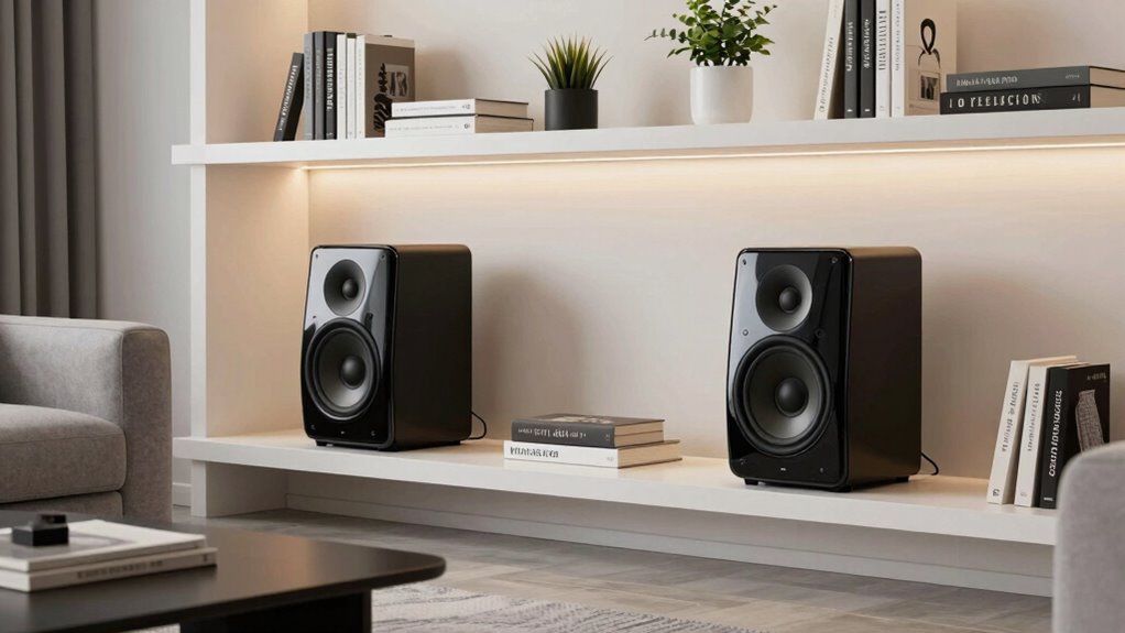 Bookshelf speakers seamlessly integrate with home theater systems by connecting to your AV receiver via speaker wires or wireless options, depending on the model. I find that they enhance sound clarity and directionality, making dialogue and effects more immersive. Setting them up involves placing them at ear level and ensuring they’re correctly calibrated with your receiver. This setup transforms your living room into a rich, cinematic sound environment.