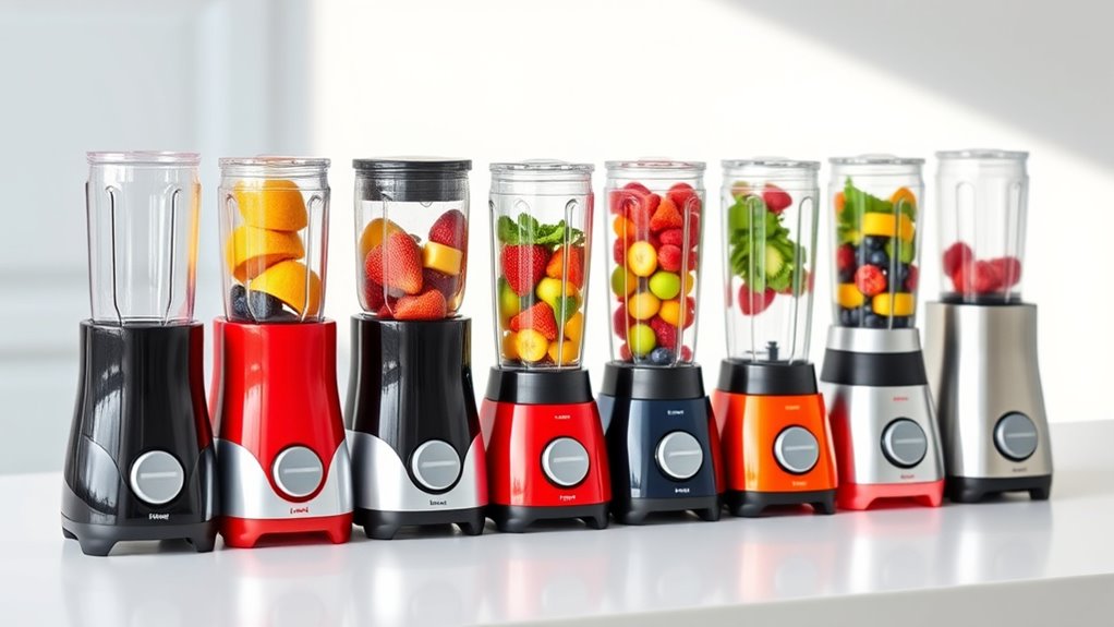The material and design of blender blades play a crucial role in how effectively a compact smoothie blender performs. I look for blades made from stainless steel because they’re strong, resistant to corrosion, and durable over time. Multiple cutting angles or leaves help guarantee thorough blending, especially for tough ingredients like ice and frozen fruits. The blade assembly’s sharpness and the number of blades directly impact how smoothly ingredients are processed. I also consider the blade’s design—detachable blades made from food-grade stainless steel make cleaning easier and reduce bacterial buildup. Additionally, the material of the jar, whether BPA-free plastic or glass, influences safety, weight, and durability, all of which contribute to the blender’s overall performance.
