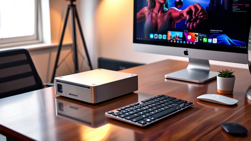 High-resolution displays are indispensable for a compact workstation Mac, especially for professional workflows that demand crisp, detailed visuals. I look for screens with 5K or 6K resolutions to guarantee sharp images and accurate editing. Support for wide color gamuts like P3 and True Tone technology is paramount for color accuracy and natural visuals, critical for creative work. Brightness levels of 1000 nits or higher help me see clearly in various lighting conditions and render HDR content accurately. High contrast ratios, often over 1,000,000:1, give me vibrant visuals with deep blacks and bright whites, essential for media production. Additionally, ProMotion’s adaptive refresh rate of up to 120Hz provides smooth motion, reducing latency during video editing and animation. These standards ensure I get the best visual experience for professional tasks.
